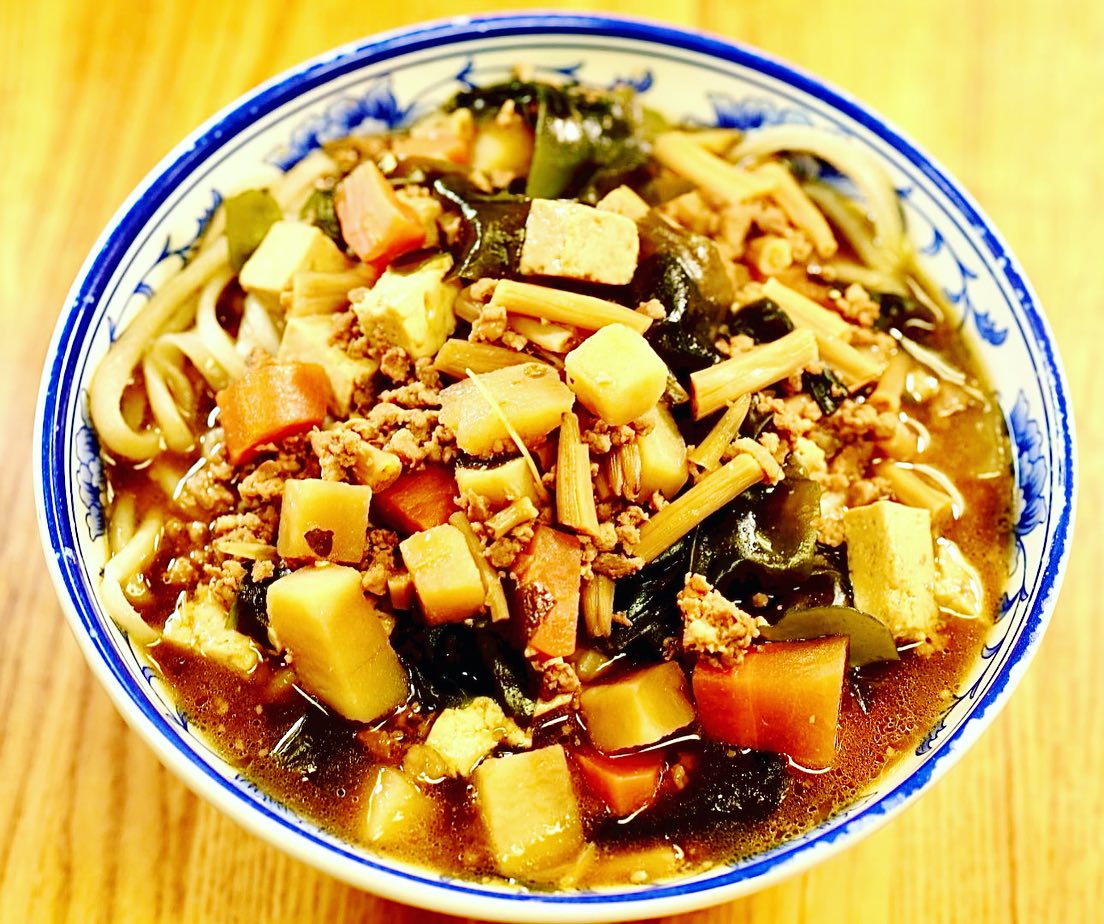 臊子汤面是一道传统的中国面食,以其浓郁的味道和多样的食材著称。它的核心是臊子汤,这种汤由肉末、蔬菜、调味料和特制的高汤熬制而成,口感酸辣适中,咸鲜回甜。臊子指的是炒制后的肉丁或肉末,通常使用猪肉,搭配豆腐丁、土豆、海带芽、干黄花、胡萝卜等丰富的配料,增添口感层次和营养。
